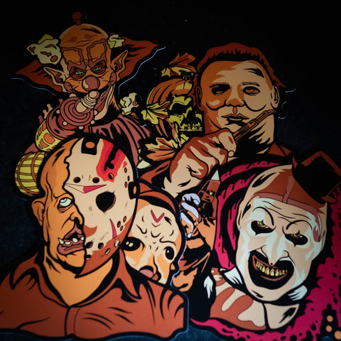 Step into the golden age of Halloween with this pack of 4 vintage-style horror cutouts, featuring a mix of iconic slashers and cult creeps from the old school to modern day. Each piece is illustrated in that perfect ’70s–’90s scare-art style—faded tones, and just the right amount of off-register print charm.